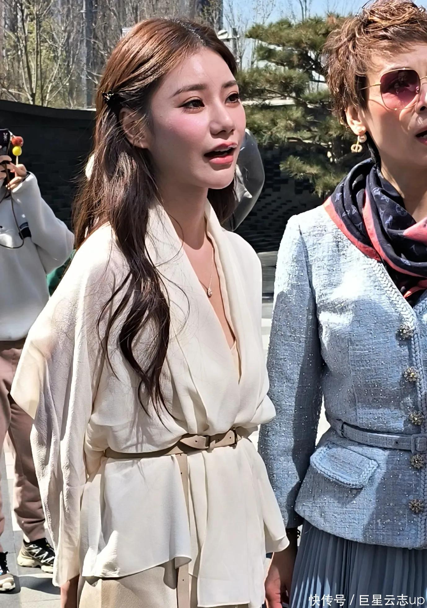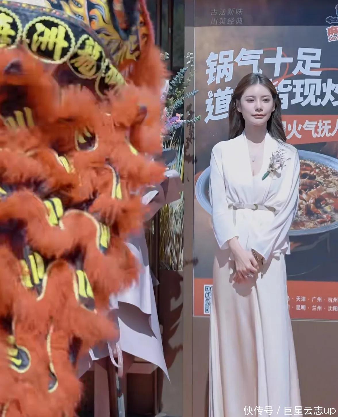 活动当天,马筱梅穿了一袭白色深V长裙,这裙子的剪裁特别显身材,一走起路来,裙摆轻轻飘动,非常有范。